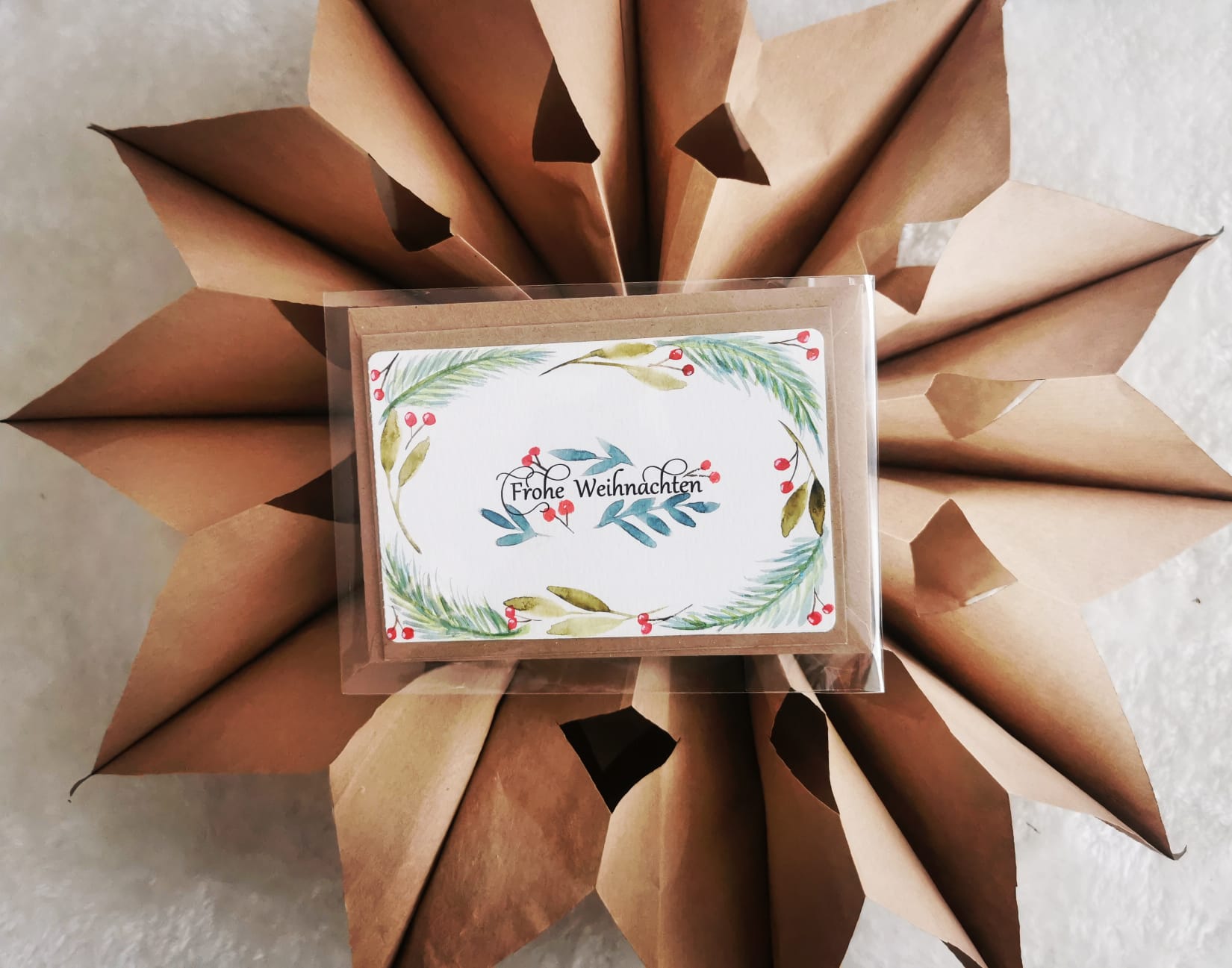 Jede Grußkarte ist handgemacht und wird einschließlich Umschlag in einer Schutzfolie versendet.